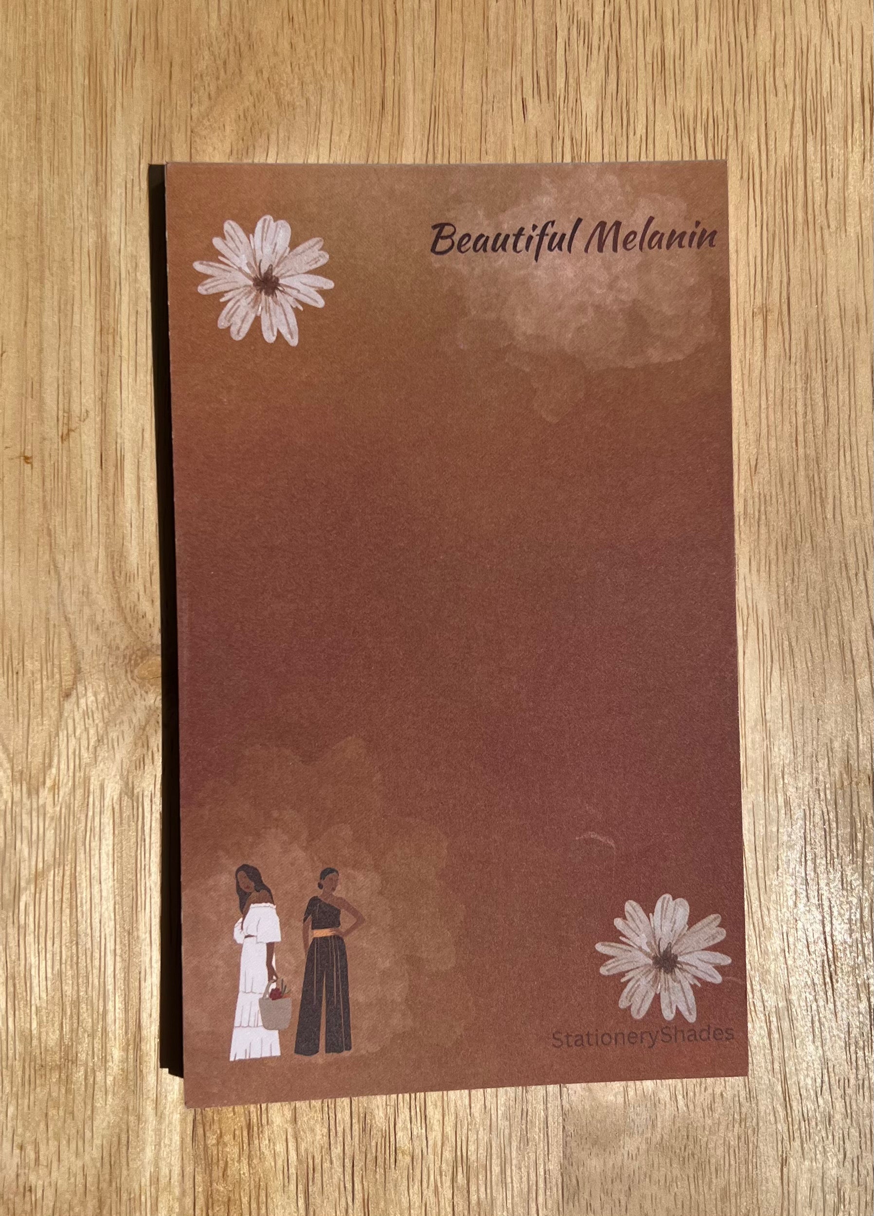 Expertly crafted and designed for your writing needs, our Beautiful Melanin Notepad boasts 50 smooth, brown sheets in a convenient 4.25 x 7 in size. Perfect for jotting down notes, ideas, or even doodles, this notepad is as beautiful as it is functional.